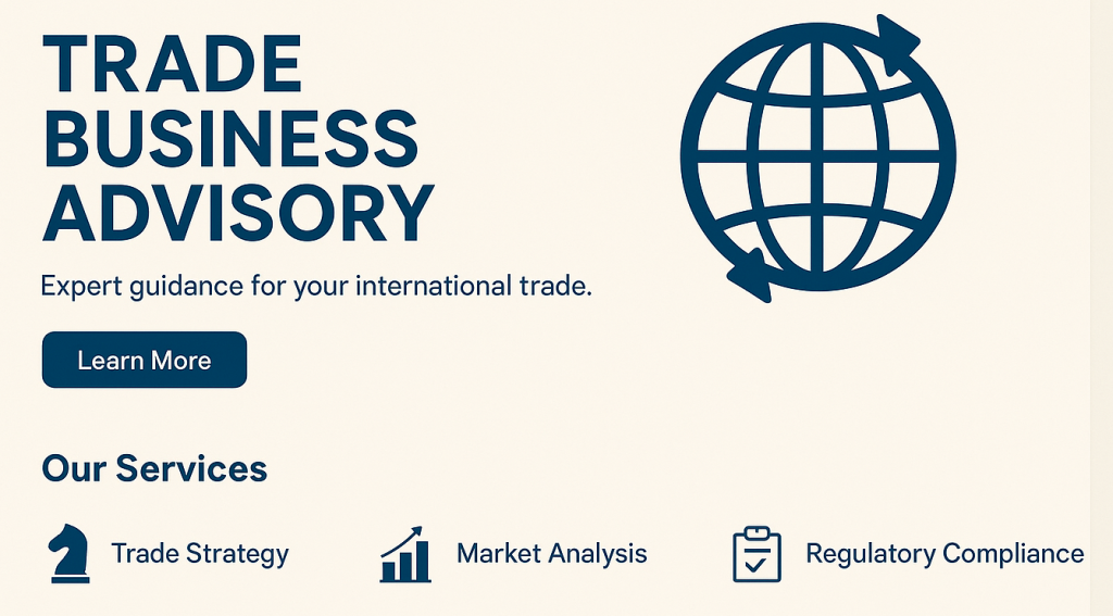 Trade Business Advisory is a premier professional services firm dedicated to guiding businesses through the complexities of global trade. We provide strategic, data-driven solutions to help you expand your reach, minimize risk, and achieve sustainable growth in international markets. Our mission is to be your trusted partner, providing the expertise and insights you need to navigate the global landscape with confidence.